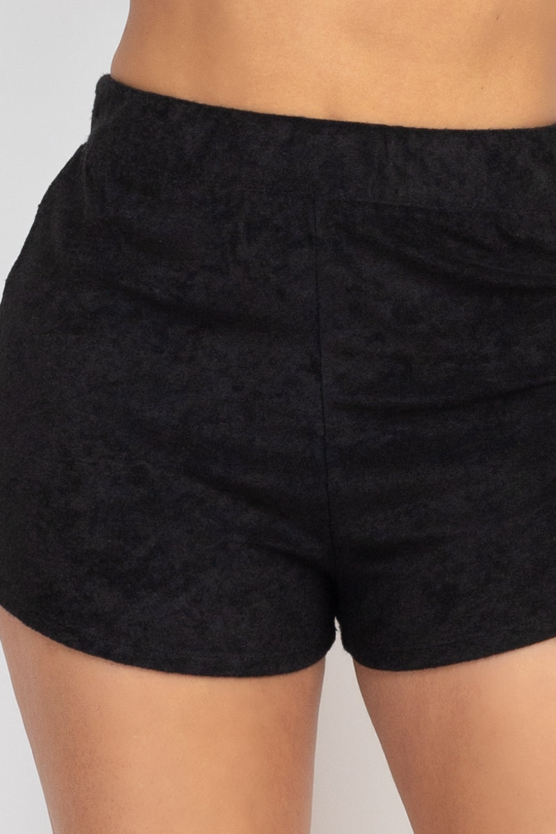 Bottom: A casual pair of terry towel shorts in solid color featuring a high rise waist, elasticized waistband and a mini length.
